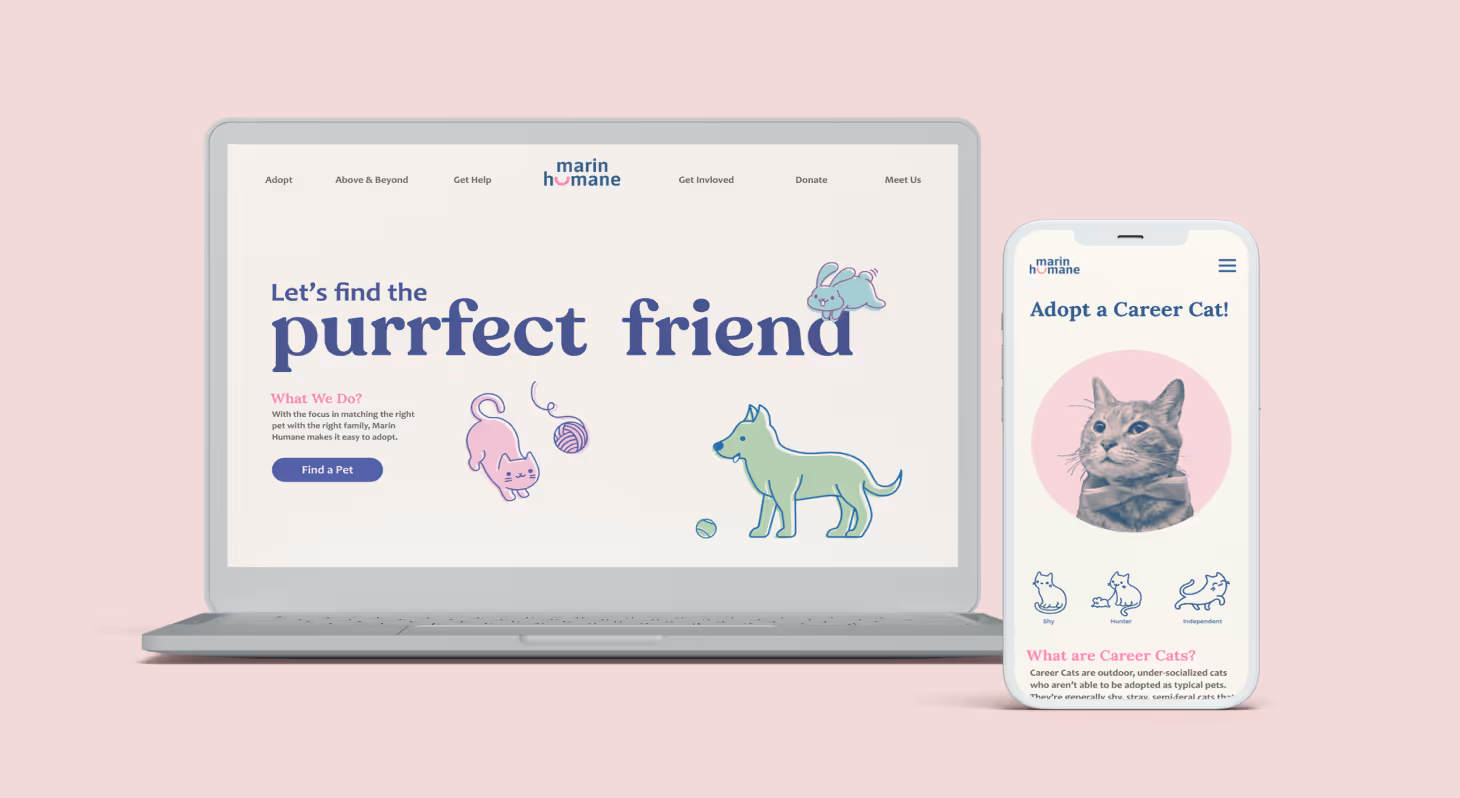 Marin Humane is on a mission to help people find their perfect furry companions. Inspired by the joy of seeing animals find their forever homes, this project aimed to create a warm welcoming online platform. As a graphic design student, my goal was to contribute to the cause of animal welfare through thoughtful design.
